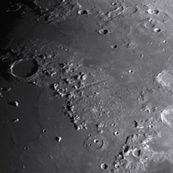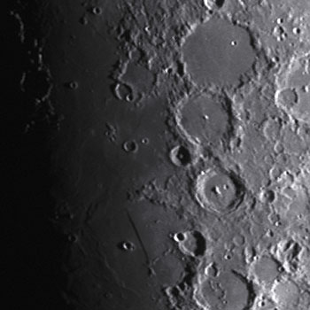 L47: Alphonsus. On the left is a chain of three craters. From north to south: Ptolemaeus, Alphonsus, Arzachel. There are several ash deposits (dark spots) within Alphonsus (look around the edge). Ejecta from the Imbrium impact basin has cut troughs in the crater wall. The central ridge is probably also due to this ejecta. L75: Ptolemaeus B. The crater inside Ptolemaeus is Ptolemaeus A. Ptolemaeus B is a saucer like depression to the north of Ptolemaeus A. Not really visible in this image. L92 Gylden Valley. This valley was created by the Imbrium impact ejecta. To the right of the bright crater above Ptolemaeus. Also see Lunar 100 77% |