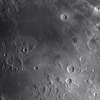 L24: Rima Hyginus. L35: Rimae Triesnecker. These faint rills are to the south of L24. Only one of them is faintly visible on this image. From the crater in the middle of L24, go SW past a small crater to a large crater. The rill is just to the right of this crater, and extends to the small crater. It also extends to the south towards a crater in the SSE. Unless you already know what it looks like, you probably will not see it in this image! |
