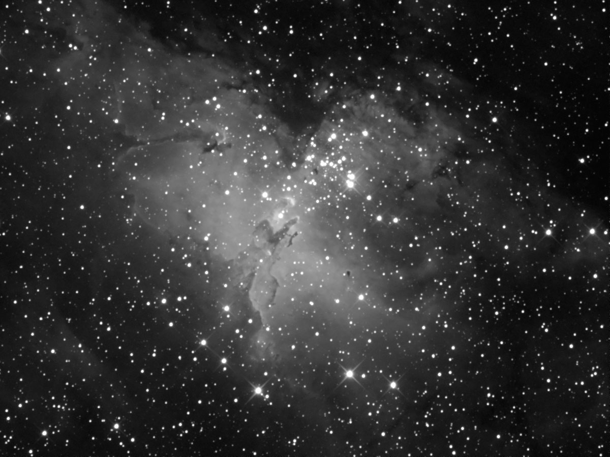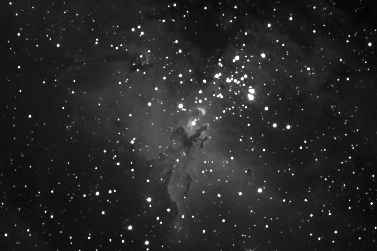 The top image has been processed to display the faint regions that surround the Eagle Nebula. The bottom image has been processed to bring out the detail in the "Pillars of Creation" at the centre of the image. The bottom photo is at 100% scale.