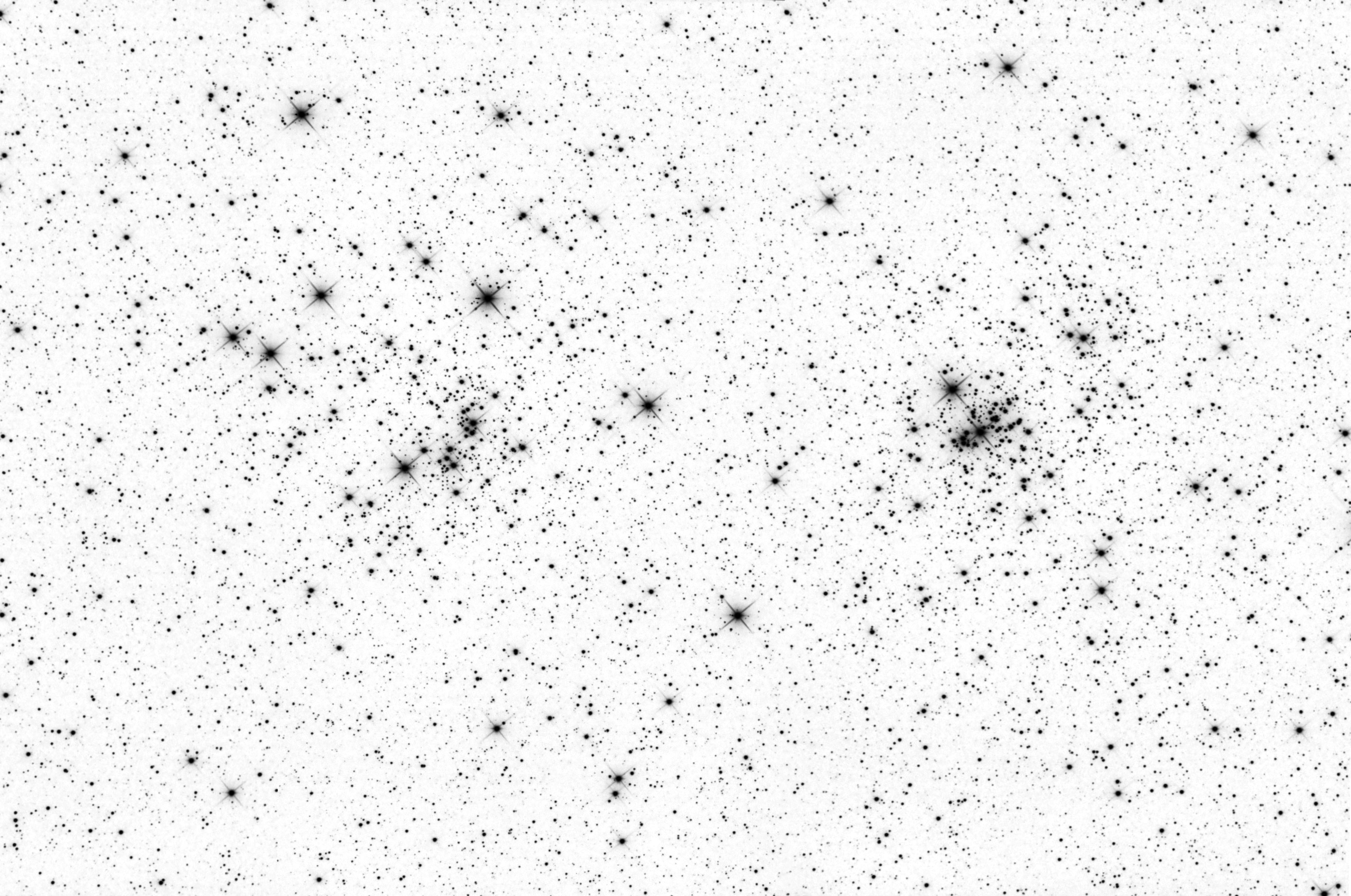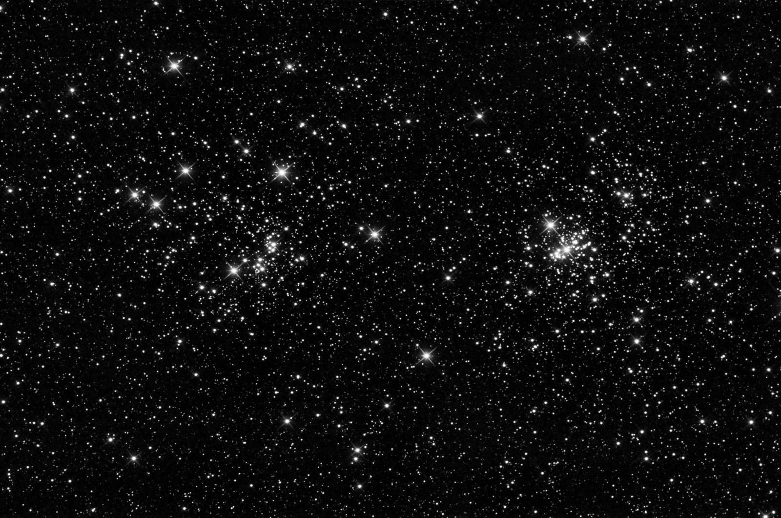 The famous double cluster in Perseus. The two clusters are at a distance of 7600 light years (NGC 869) and 6800 light years (NGC 884). These two clusters are therefore close together in space - this is not just a chance line of sight effect. The two clusters collapsed from the same gas cloud. The two clusters are also very young - 5.6 million years (NGC 869) and 3.2 million years (NGC 884). On an astronomical time scale this is very young. For example, the Pleiades star cluster is some where between 75 and 150 million years old. The two clusters are approaching us at 22km/s and 21km/s respectively. The brightest main sequence stars in these two clusters have a spectral type of B0.