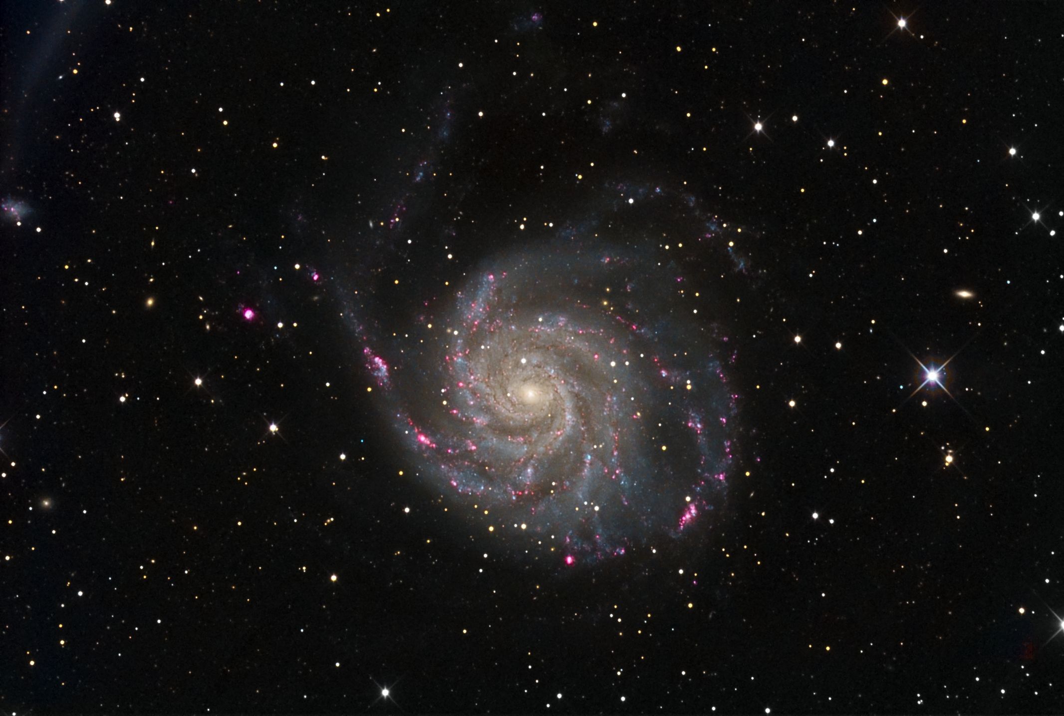 This spiral galaxy in Ursa Major has a large apparent size of 22 arc minutes. It's also quite bright at magnitude 7.9, but due to the large area the surface brightness is quite low. The distance to this galaxy has determined by observing Cepheid variables with the Hubble telescope back in 1994 / 1995. According to the recent recalibration of the Cepheid distance scale, the distance is about 27 million light years. Such a large apparent size at this distance indicates that this is an enormous spiral galaxy (170,000 light years in diameter – almost twice the diameter of our own galaxy).